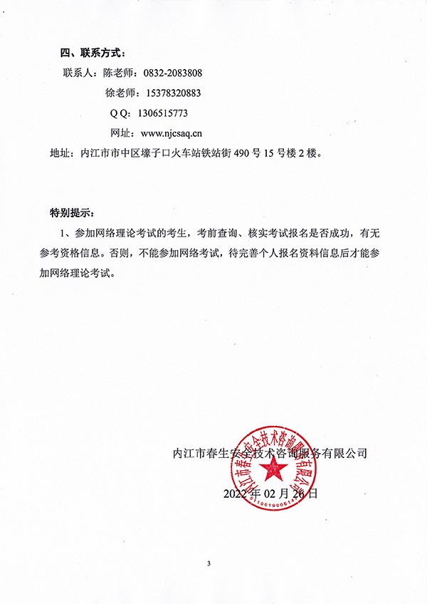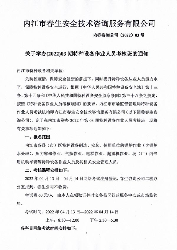 2022年春生公司03期特種設(shè)備作業(yè)人員考核時間安排