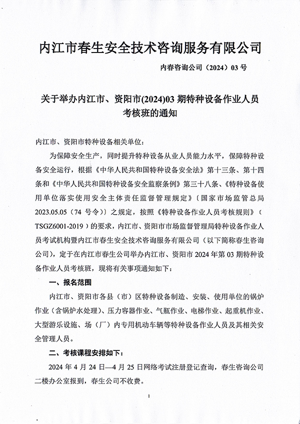 關(guān)于舉辦內(nèi)江市、資陽(yáng)市(2024)03期特種設(shè)備作業(yè)人員考核班的通