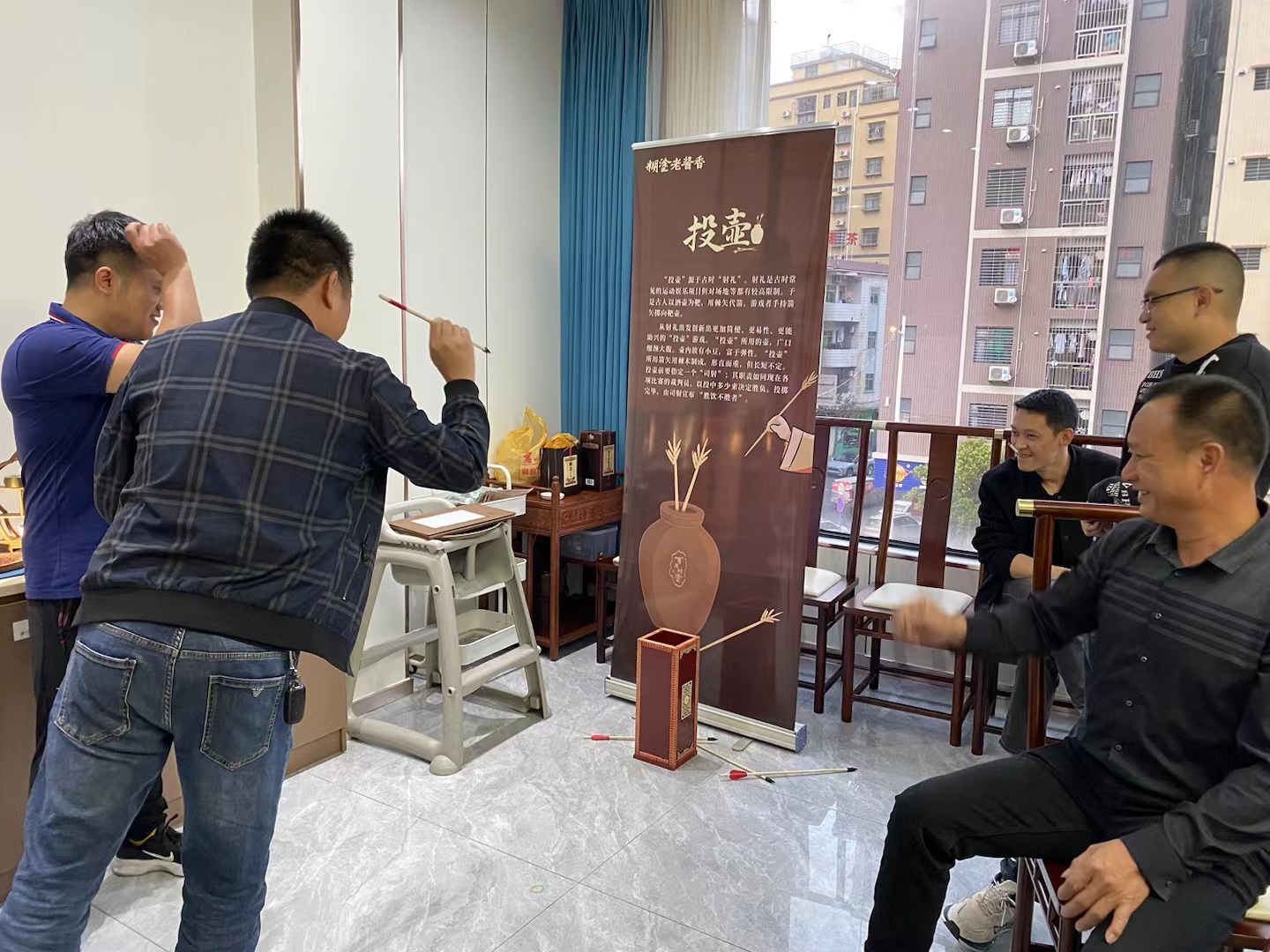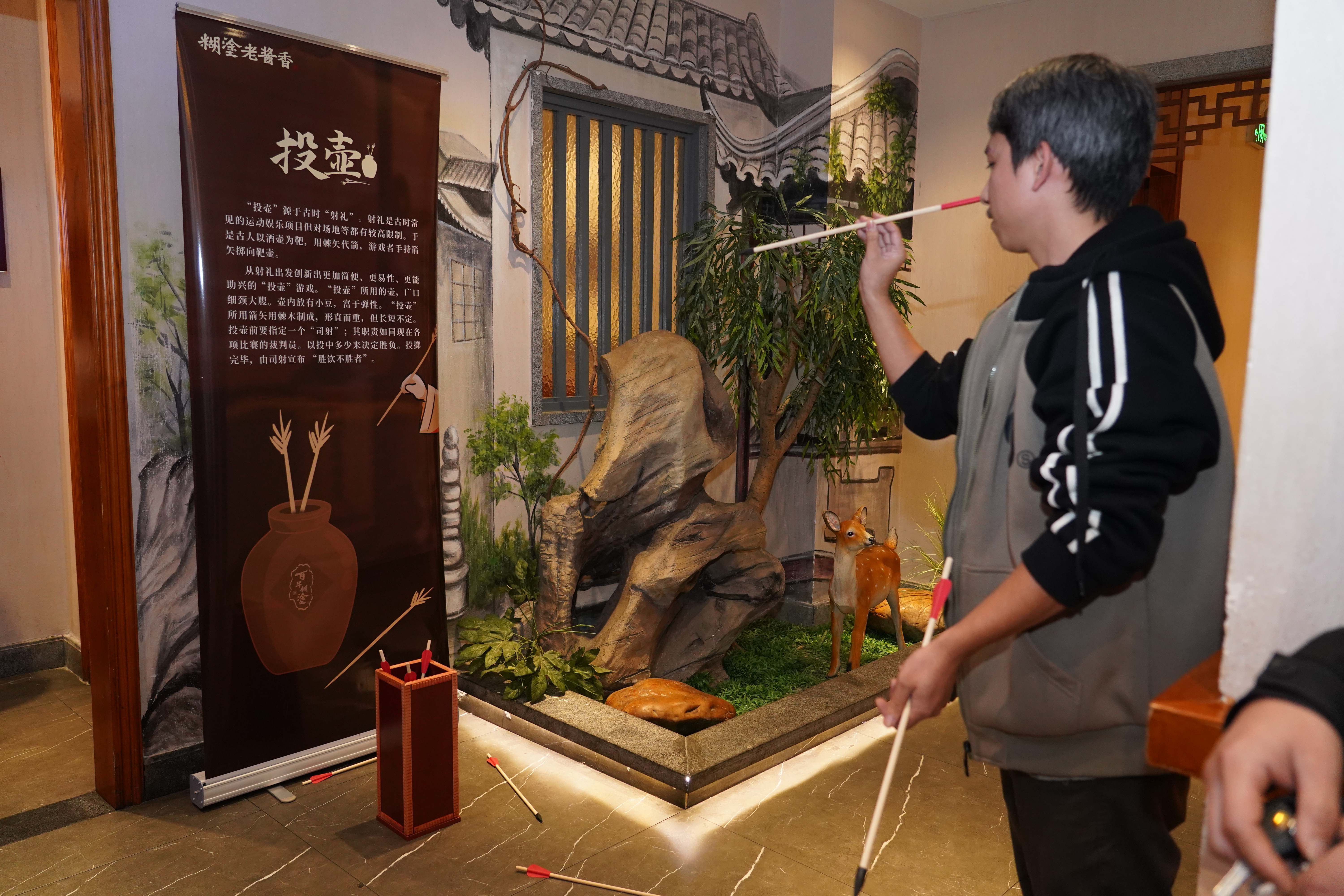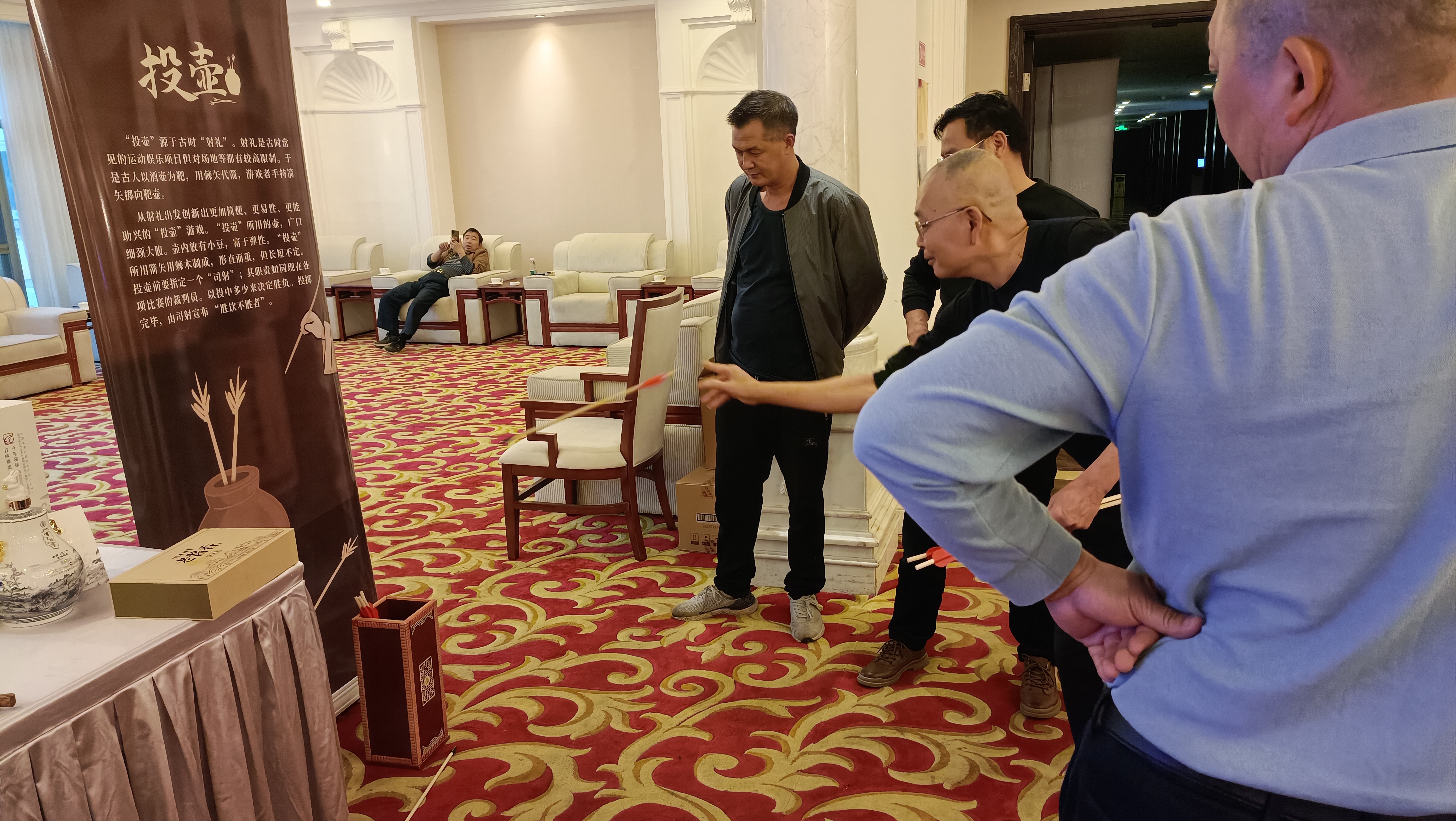 用餐的地方選在典雅安靜的包房,小有格調(diào),韻味十足。一進(jìn)門,就能看到一個古色古香的投壺,一些技癢的朋友圍在一旁,嘗試將箭矢投入壺中。這是中國傳統(tǒng)的游戲,古代皇宮貴族飲酒聚會時,常常會比較一番。趣味的投壺小游戲,瞬間就卸下了大家成年人的面具,大老爺們兒也都擼起袖子,想比一比誰更技藝高超。