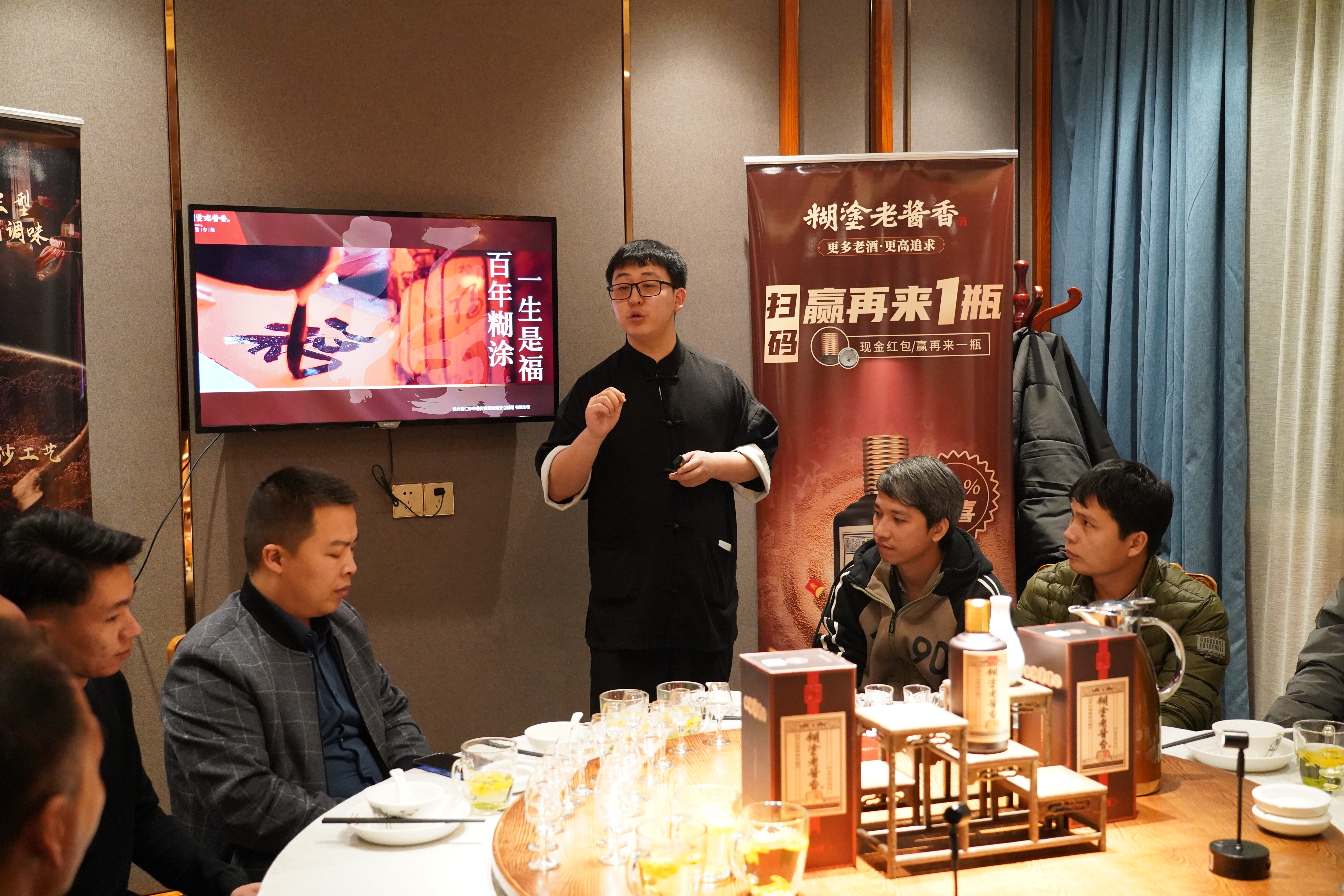 講解結(jié)束后,為了不打擾客戶和老友之間的聚餐,品鑒師會先行退場。不過,在很多時候,品鑒師會被大家拉著一起參加晚宴。晚宴上,大家談笑風(fēng)生,嬉笑怒罵皆成文章,沒有硬性銷售,晚宴就跟平時的老友聚會沒什么區(qū)別,然而這反而產(chǎn)生了不一樣的效果:盡管沒有銷售引導(dǎo),許多來賓卻愿意主動購買,乃至尋求與糊涂老醬香合作的途徑。這或許要得益于,相比于普通的動銷模式,一星晚宴更真誠,也更具感染力。