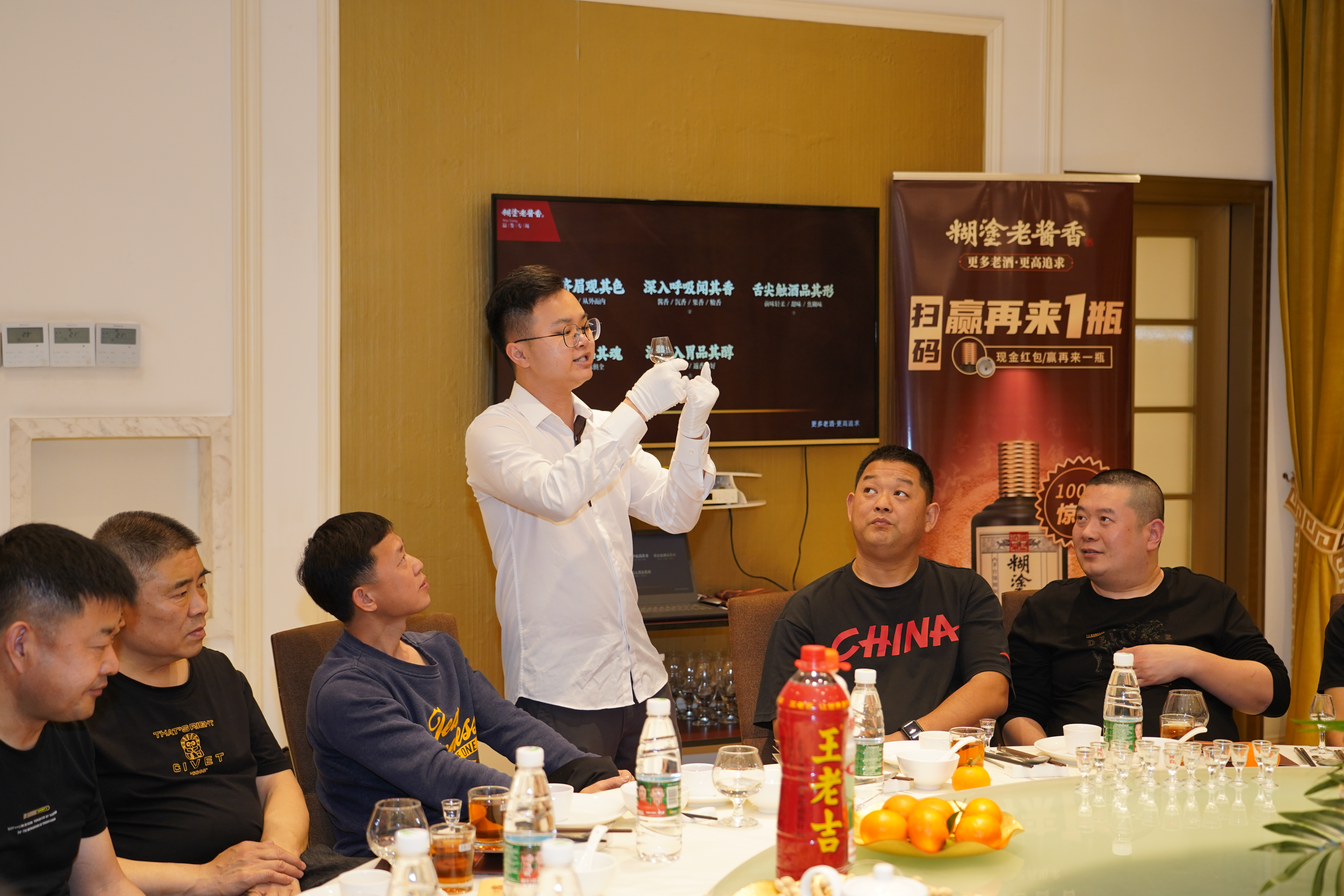 客人們落座后,將由糊涂老醬香品牌品鑒師為大家對一星進(jìn)行講解:從在茅臺鎮(zhèn)核心產(chǎn)區(qū)擁有1200畝的花園酒廠,到糊涂酒業(yè)成為茅臺鎮(zhèn)第一家獲得真年份雙認(rèn)證白酒企業(yè),品鑒師一路娓娓道來,讓大家直觀的感受糊涂酒業(yè)的硬實(shí)力背書。