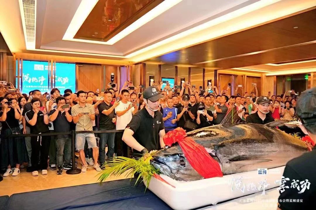 令人激情澎湃的大會方結(jié)束,一場視覺和味蕾的雙重盛宴又將登場——重達500斤的西班牙藍鰭金槍魚跨越大洋,“魚躍”至此,以饗諸位到場的朋友們。開魚儀式上,十多位料理師傅共同操作,如庖丁解牛般,將開魚儀式變成了一場充滿美感的視覺表演,引來大家的重重圍觀。